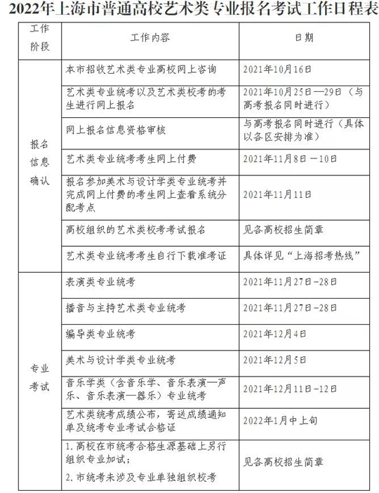 2022年上海市普通高校藝術(shù)類專業(yè)報(bào)名考試工作日程表