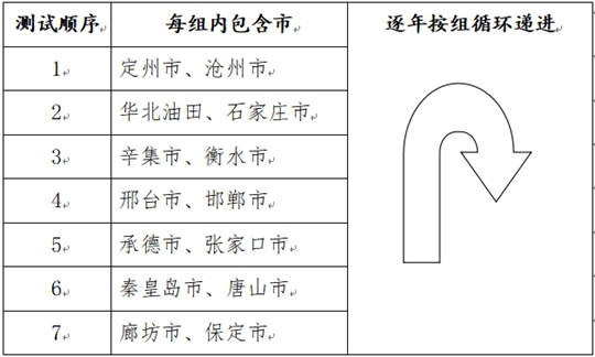 4.測試順序:采取循環遞進方式安排各市考生測試順序。具體辦法為:每2市為一組,按往年測試順序將14個市分為7個組,逐年按組循環遞進。2025年測試順序依次為: