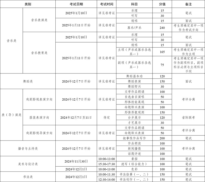 自治區2025年普通高等學校招生藝術類專業統考科目及時間表