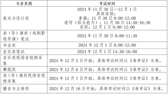 (2)藝術(shù)類專業(yè)省級統(tǒng)考筆試科目安排在2024年11月30日—12月1日進(jìn)行,現(xiàn)場音視頻采集科目于2024年12月5日開始。