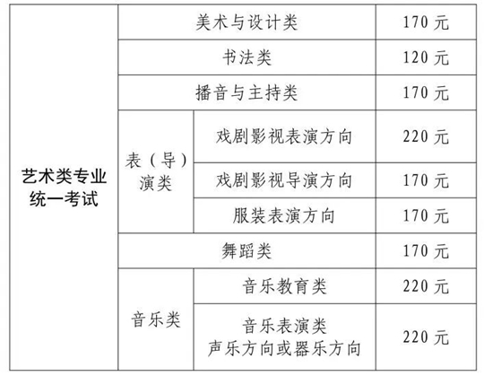 高考大報名和藝術類專業市統考網上報名成功的考生,須于規定時間內(屆時以“上海招考熱線”公告安排為準),通過“上海招考熱線”報名系統支付所選擇的藝術類專業統考項目相應的考試費用(每項藝術類專業統考報名費20元/人,統考的每科目考試費50元/科)。各類收費標準如下: