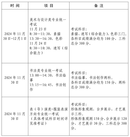 1.考試科目及時間本市藝術類專業市統考分六大類別,部分類別細分方向小類。具體包括美術與設計類、書法類、表(導)演類-戲劇影視表演方向、表(導)演類-戲劇影視導演方向、表(導)演類-服裝表演方向、播音與主持類、舞蹈類、音樂類(音樂教育類)、音樂類(音樂表演類—聲樂方向)和音樂類(音樂表演類—器樂方向)十個類別的考試。具體安排如下: