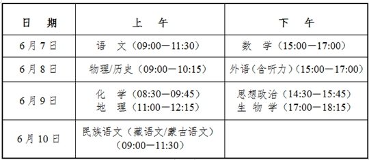 全國統(tǒng)考科目考試時間按照教育部安排進行,選考科目與全國統(tǒng)考科目同步進行,考試時間安排在6月7日至10日。語文科目考試時長為150分鐘,數(shù)學(xué)、外語科目(含聽力部分)考試時長為120分鐘,選考科目考試時長均為75分鐘。民族語文科目考試時長為150分鐘。如全國統(tǒng)考科目考試時間調(diào)整,選考科目考試時間相應(yīng)調(diào)整。具體考試時間安排如下: