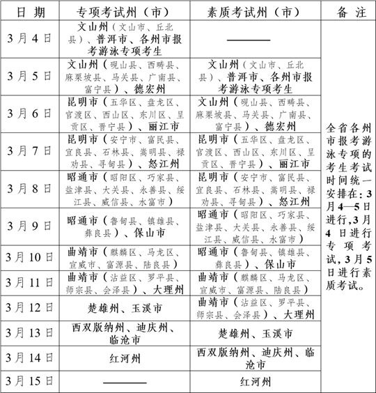 2025年3月4—15日(共12天),各州市具體日程安排詳見下表。其中,全省各州市報考游泳專項的考生考試時間統一安排在3月4—5日進行,3月4日進行專項考試,3月5日進行素質考試。如遇不可抗拒因素考試無法正常進行時,考試時間依次順延。