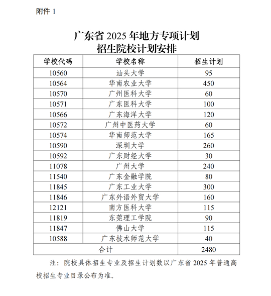 1.廣東省2025年地方專項計劃招生院校計劃安排