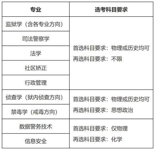 報考中央司法警官學院偵查學(獄內偵查方向)、禁毒學(戒毒方向)必選政治科目,數據警務技術、信息安全必選物理、化學科目,其他專業選考科目不限。各專業選考科目要求見下表: