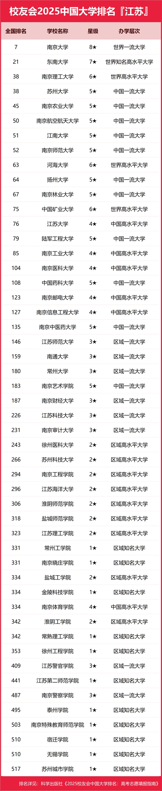 校友會2025江蘇省大學排名,南京大學第一,揚州大學前十