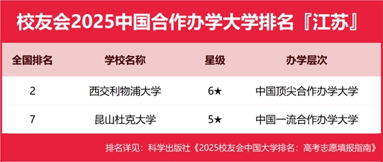 校友會2025江蘇省合作辦學大學排名,西交利物浦大學第一,昆山杜克大學第二