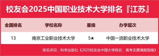 在校友會2025江蘇省職業技術大學排名中,南京工業職業技術大學位居全國第13名,雄居校友會2025江蘇省職業技術大學排名首位。