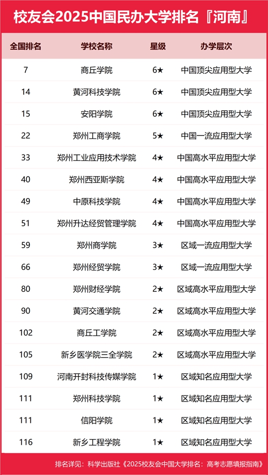 校友會2025河南省民辦大學排名,商丘學院第一,黃河科技學院前二