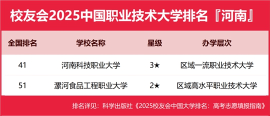 校友會2025河南省職業技術大學排名,河南科技職業大學第一,漯河食品工程職業大學第二