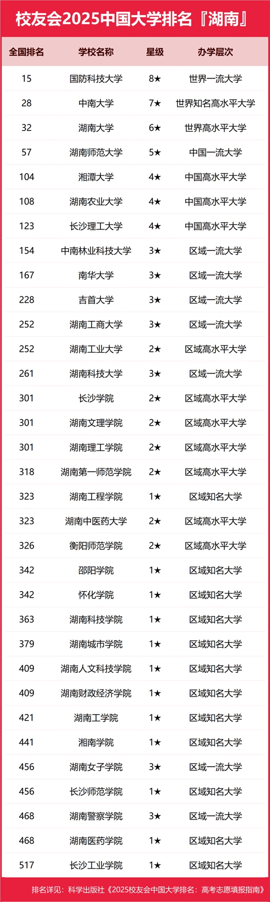 校友會2025湖南省大學排名,國防科技大學、湖南信息學院、長沙民政職業技術學院第一 |