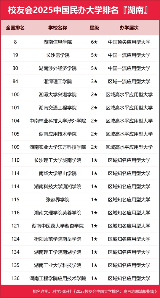 校友會2025湖南省民辦大學排名,湖南信息學院第一,湖南涉外經濟學院第三