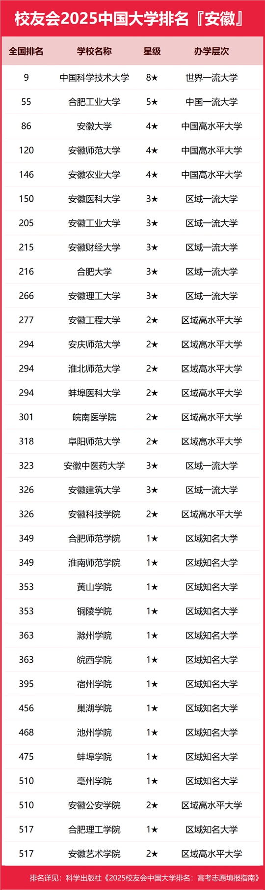 校友會2025安徽省大學排名,中國科學技術大學、安徽三聯學院、合肥職業技術學院等第一 |