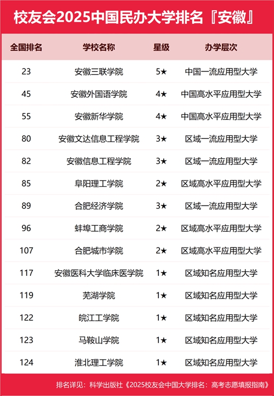 在校友會2025安徽省民辦大學排名中,安徽三聯學院位居全國第23名,雄居校友會2025安徽省民辦大學排名首位,安徽外國語學院位居全國第45名,位居第2。安徽新華學院位居全國第55名,位居第3。安徽文達信息工程學院(第80)第4,安徽信息工程學院(第82)第5,阜陽理工學院(第85)第6,合肥經濟學院(第89)第7,蚌埠工商學院(第96)第8,合肥城市學院(第107)第9,安徽醫科大學臨床醫學院(第117)第10,