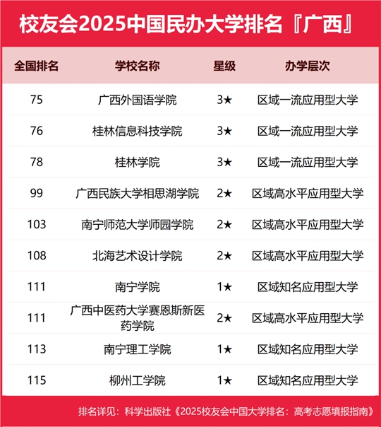 校友會2025廣西壯族自治區民辦大學排名,廣西外國語學院第一,桂林信息科技學院第二