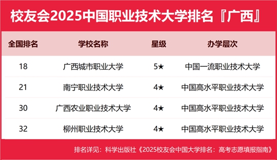 校友會2025廣西壯族自治區職業技術大學排名,廣西城市職業大學第一,南寧職業技術大學第二