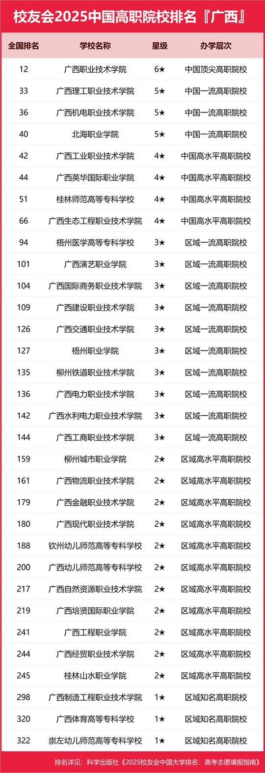 校友會2025廣西壯族自治區高職院校排名,廣西職業技術學院第一,廣西理工職業技術學院第二