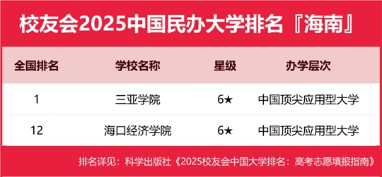 校友會2025海南省民辦大學排名,三亞學院第一,海口經濟學院第二