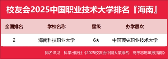 在校友會2025海南省職業技術大學排名中,海南科技職業大學位居全國第2名,雄居校友會2025海南省職業技術大學排名首位。