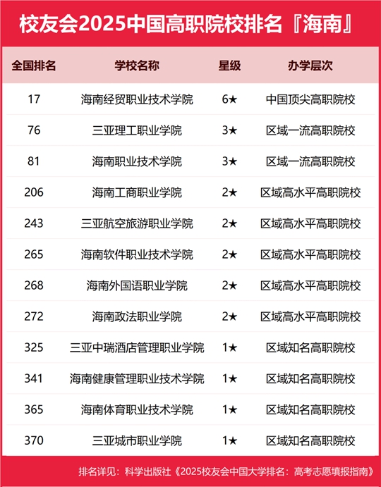 在校友會2025海南省高職院校排名中,海南經貿職業技術學院位居全國第17名,雄居校友會2025海南省高職院校排名首位,三亞理工職業學院位居全國第76名,位居第2。海南職業技術學院位居全國第81名,位居第3。海南工商職業學院(第206)第4,三亞航空旅游職業學院(第243)第5,海南軟件職業技術學院(第265)第6,海南外國語職業學院(第268)第7,海南政法職業學院(第272)第8,三亞中瑞酒店管理職業學院(第325)第9,海南健康管理職業技術學院(第341)第10。