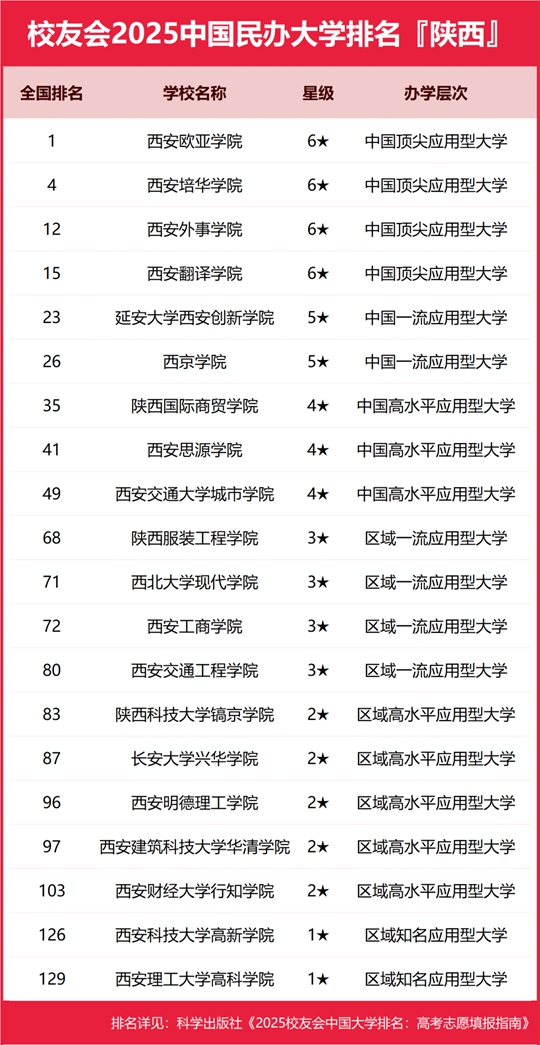 校友會2025陜西省民辦大學排名,西安歐亞學院第一,西安培華學院第二