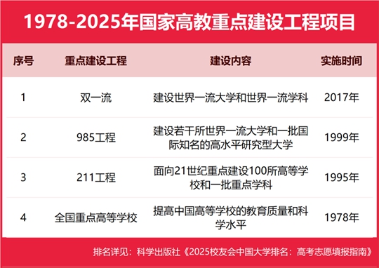 1978年至今,全國有北京大學、清華大學、中國科學院大學、復旦大學、浙江大學、上海交通大學、南京大學、華中科技大學、武漢大學、南開大學、中國人民大學,以及燕山大學、江蘇大學、陜西科技大學等158所大學躋身雙一流、985工程、211工程和全國重點高等學校等四大重點建設名單,這些高校均是全國綜合實力強、辦學水平高和國家定位高的“中國重點大學”。