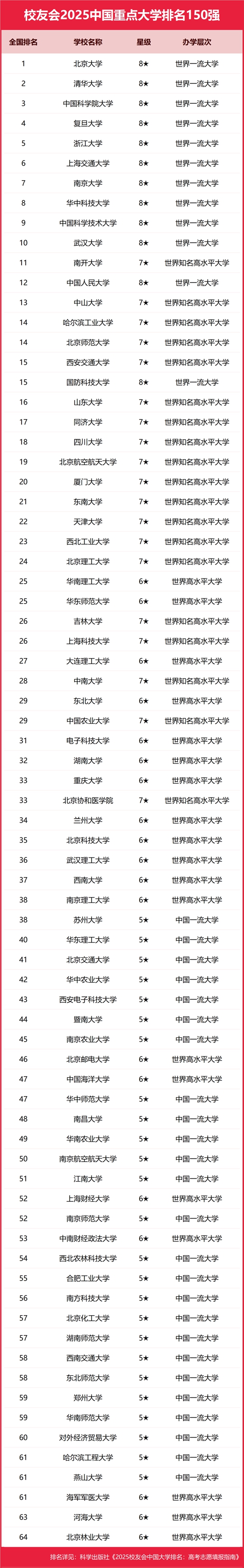 榜單顯示,在入選國家雙一流、985工程、211工程和全國重點高等學校的“中國重點大學”中,北京大學、清華大學問鼎校友會2025中國重點大學排名冠亞軍,是最受國家重視、綜合實力最強、辦學水平最高的中國最高學府,是2025年中國高考最優秀考生的首選。