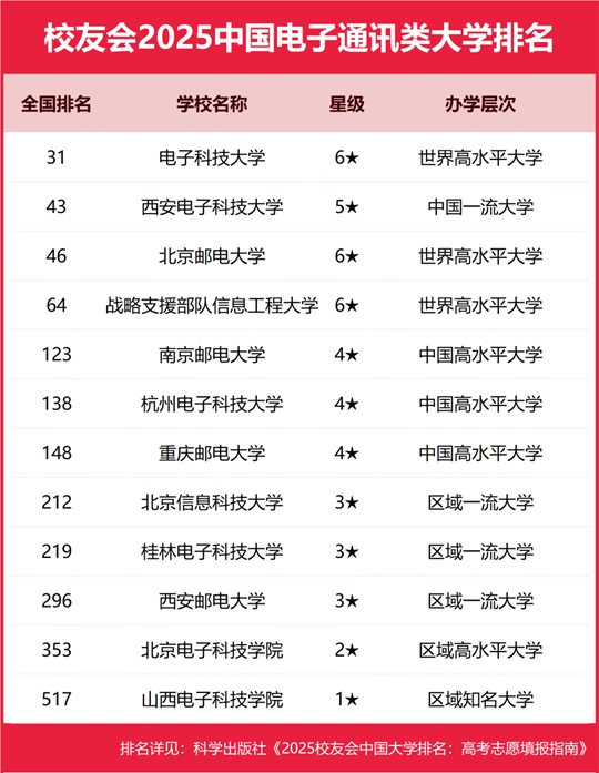 榜單顯示,在校友會2025中國大學(xué)排名中,電子科技大學(xué)全國排名第31名,雄居校友會2025中國電子通訊類大學(xué)排名第一。西安電子科技大學(xué)第二,北京郵電大學(xué)第三,戰(zhàn)略支援部隊信息工程大學(xué)第四,南京郵電大學(xué)第五。