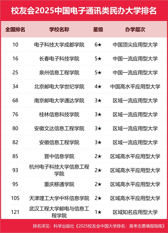 電子科技大學(xué)成都學(xué)院位列2025中國電子通訊類民辦大學(xué)排名榜首,泉州信息工程學(xué)院前三