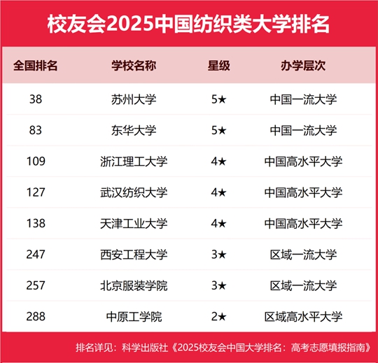 校友會2025中國紡織類大學排名,蘇州大學、江西服裝學院、山東服裝職業學院第一 |