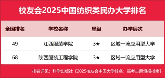 江西服裝學院位列2025中國紡織類民辦大學排名榜首,陜西服裝工程學院第二