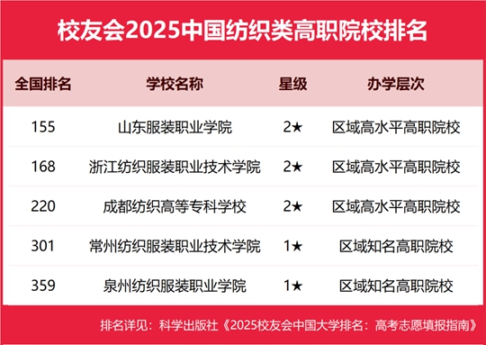 山東服裝職業學院勇奪2025中國紡織類高職院校排名第一,成都紡織高等專科學校前三