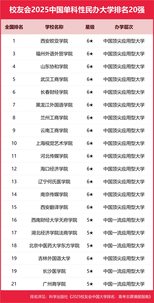 校友會(huì)2025中國(guó)單科性民辦大學(xué)排名,西安歐亞學(xué)院第一,福州外語(yǔ)外貿(mào)學(xué)院、山東協(xié)和學(xué)院前三 |
