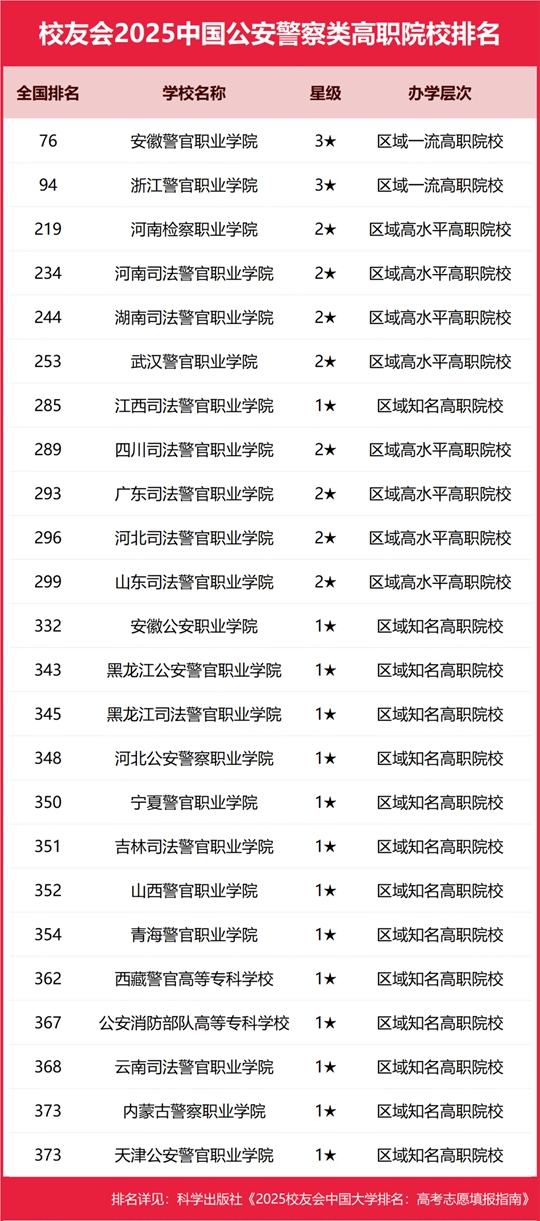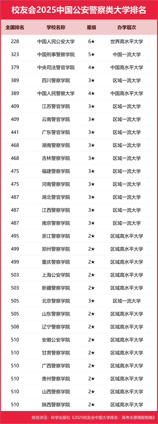 校友會2025中國公安警察類大學排名,中國人民公安大學、安徽警官職業學院第一 |