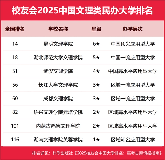 昆明文理學(xué)院位列2025中國文理類民辦大學(xué)排名榜首,湖北師范大學(xué)文理學(xué)院第二