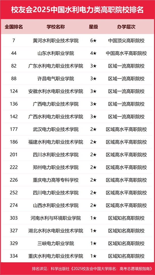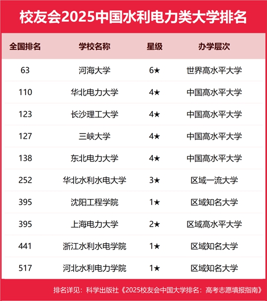 校友會2025中國水利電力類大學排名,河海大學、黃河水利職業技術學院第一 |