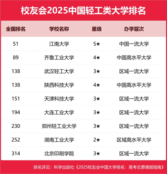 校友會2025中國輕工類大學排名,江南大學、華北理工大學輕工學院、天津輕工職業技術學院第一 |