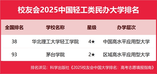 華北理工大學輕工學院位列2025中國輕工類民辦大學排名榜首,茅臺學院第二
