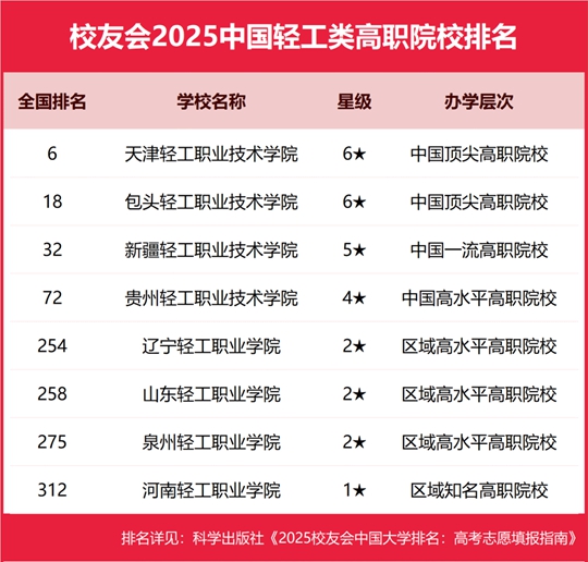 天津輕工職業技術學院勇奪2025中國輕工類高職院校排名第一,貴州輕工職業技術學院第四