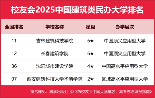 吉林建筑科技學院位列2025中國建筑類民辦大學排名榜首,沈陽城市建設學院前三