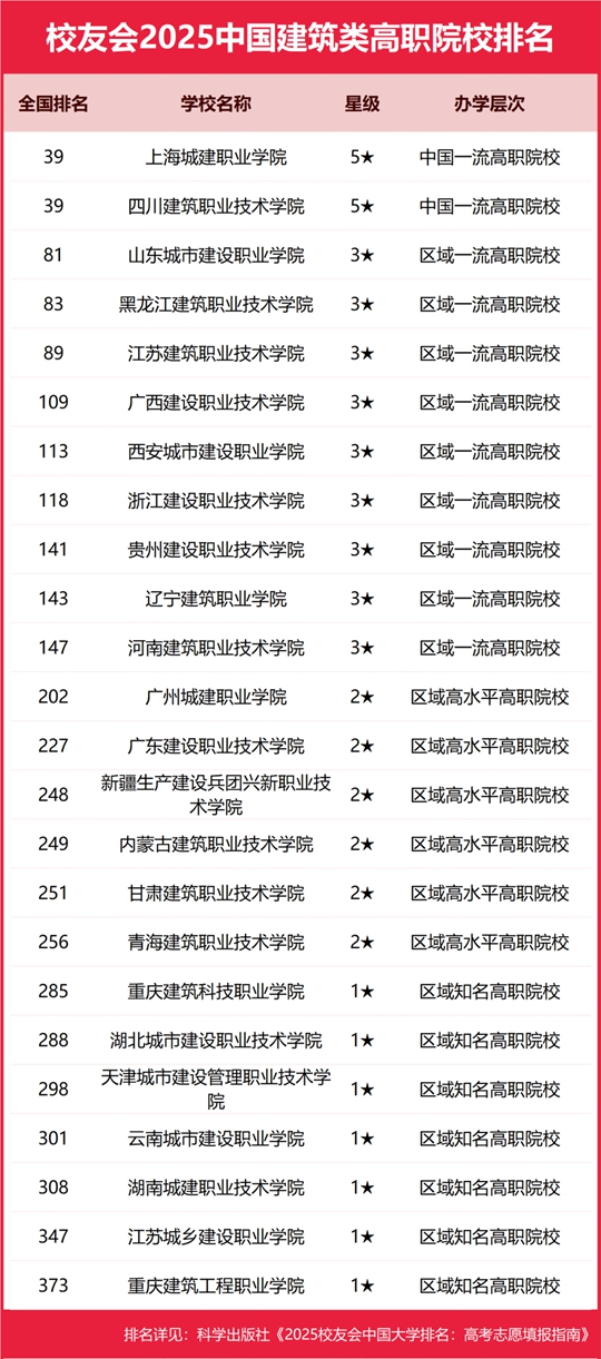 上海城建職業學院、四川建筑職業技術學院勇奪2025中國建筑類高職院校排名并列第一,江蘇建筑職業技術學院第五