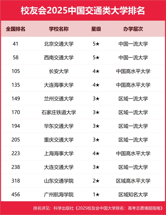 榜單顯示,在校友會(huì)2025中國大學(xué)排名中,北京交通大學(xué)全國排名第41名,雄居校友會(huì)2025中國交通類大學(xué)排名第一。西南交通大學(xué)第二,長安大學(xué)第三,大連海事大學(xué)第四,蘭州交通大學(xué)第五。