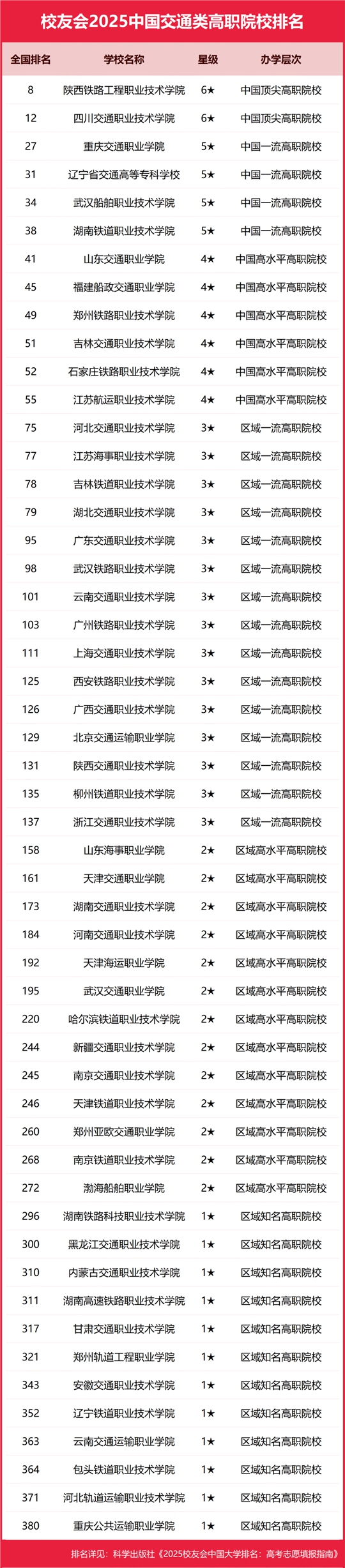在校友會(huì)2025中國高職院校排名中,陜西鐵路工程職業(yè)技術(shù)學(xué)院全國排名第8名,名列校友會(huì)2025中國城市高職院校排名冠軍。四川交通職業(yè)技術(shù)學(xué)院第二,重慶交通職業(yè)學(xué)院第三,遼寧省交通高等專科學(xué)校第四,武漢船舶職業(yè)技術(shù)學(xué)院第五。
