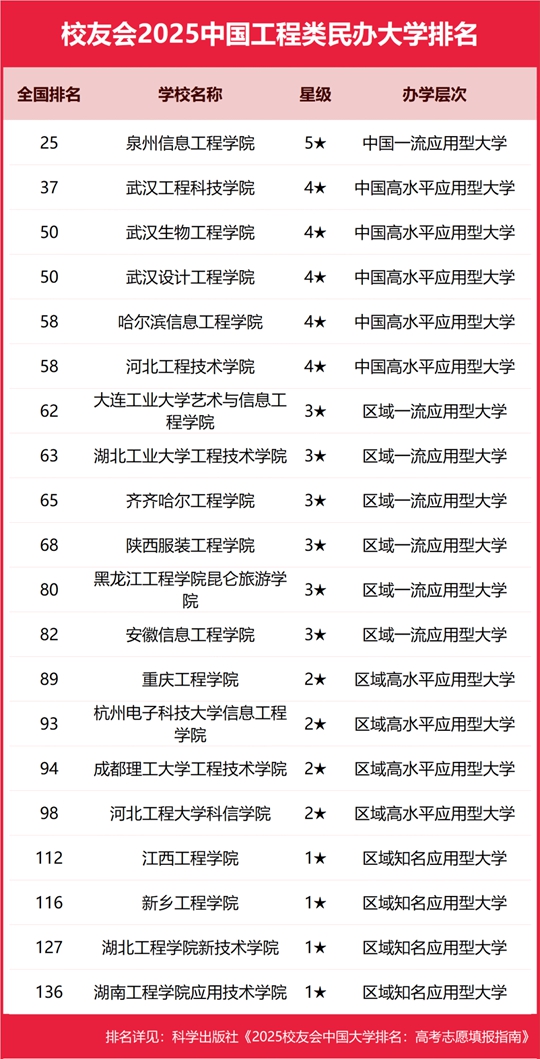 泉州信息工程學院位列2025中國工程類民辦大學排名榜首,武漢工程科技學院第二