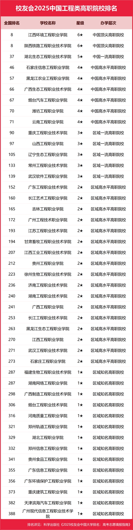 在校友會2025中國高職院校排名中,江西環境工程職業學院、陜西鐵路工程職業技術學院全國排名并列第30名,名列校友會2025中國城市高職院校排名冠軍。湖北生態工程職業技術學院第三,石家莊信息工程職業學院第四,黑龍江農業工程職業學院第五。