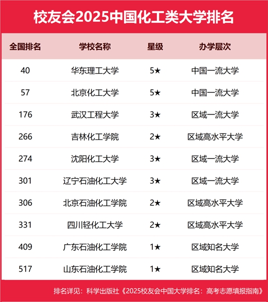 校友會2025中國化工類大學排名,華東理工大學、湖南化工職業技術學院第一 |