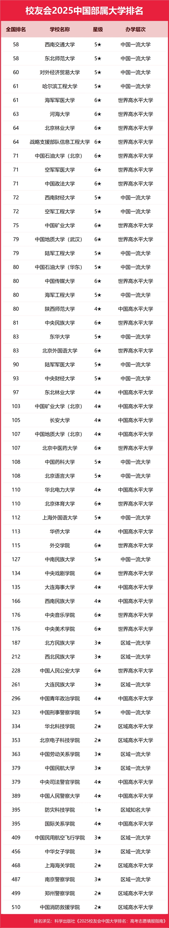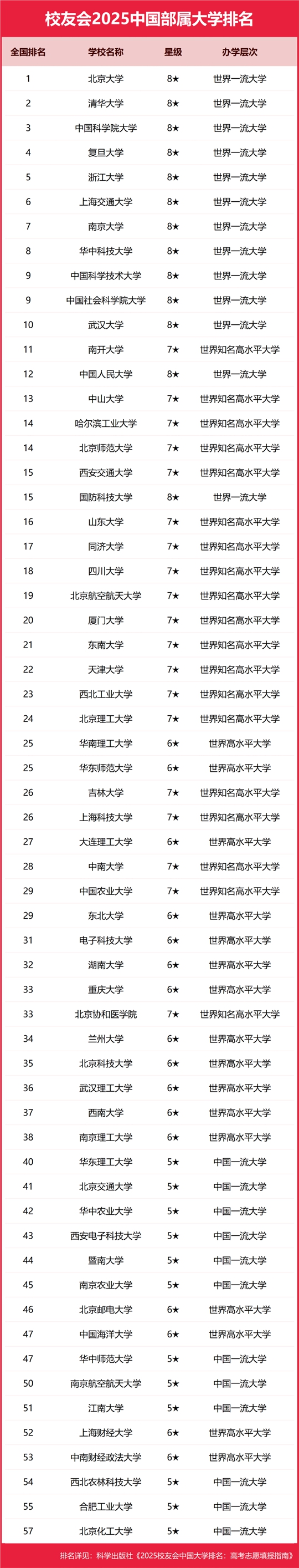 校友會2025中國部屬大學排名,北京大學第一,中國科學院大學、中國社會科學院大學前十 |