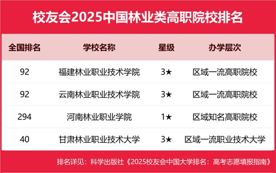 福建林業(yè)職業(yè)技術(shù)學(xué)院、云南林業(yè)職業(yè)技術(shù)學(xué)院勇奪2025中國(guó)林業(yè)類高職院校排名并列第一,河南林業(yè)職業(yè)學(xué)院前三
