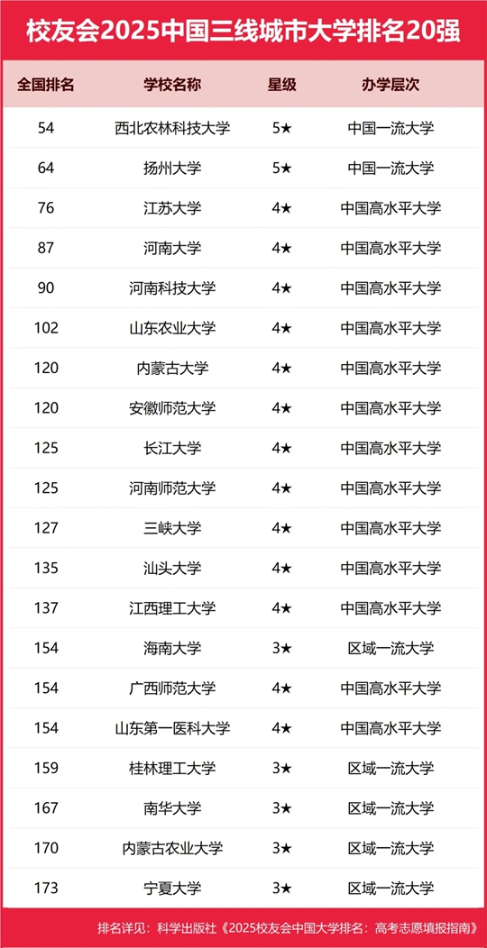 在校友會2025中國各線城市大學排名中,北京大學、浙江大學、哈爾濱工業大學、西北農林科技大學、燕山大學、四川農業大學分列校友會2025中國一線城市、新一線城市、二線城市、三線城市、四線城市和五線城市大學排名第一。